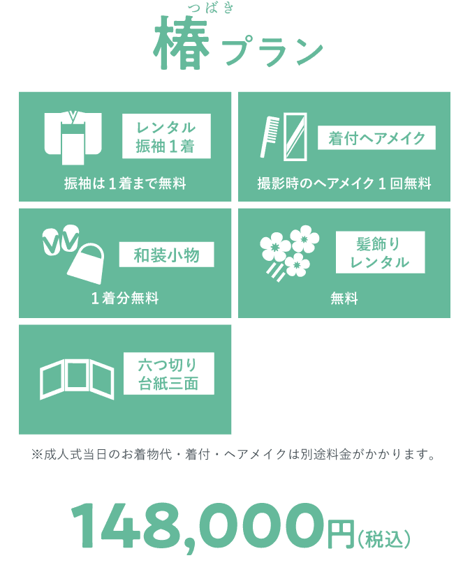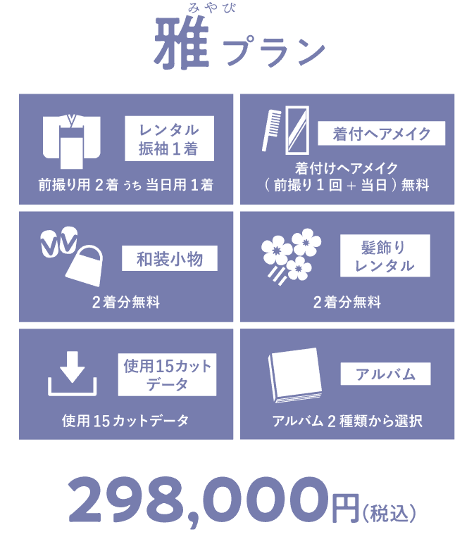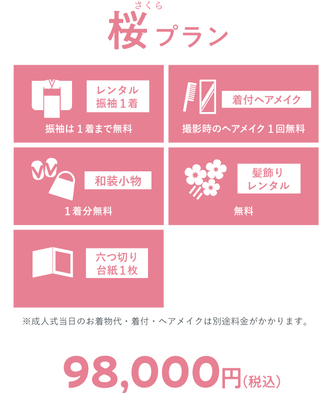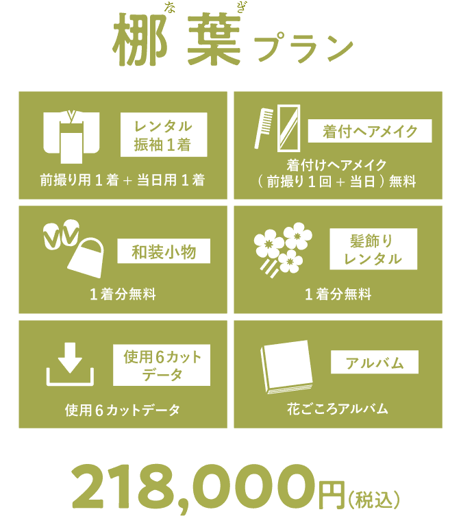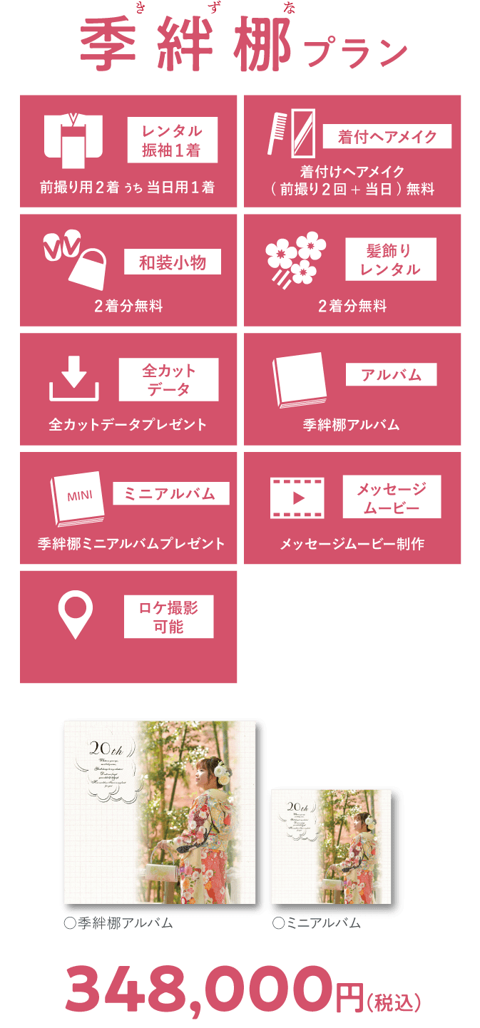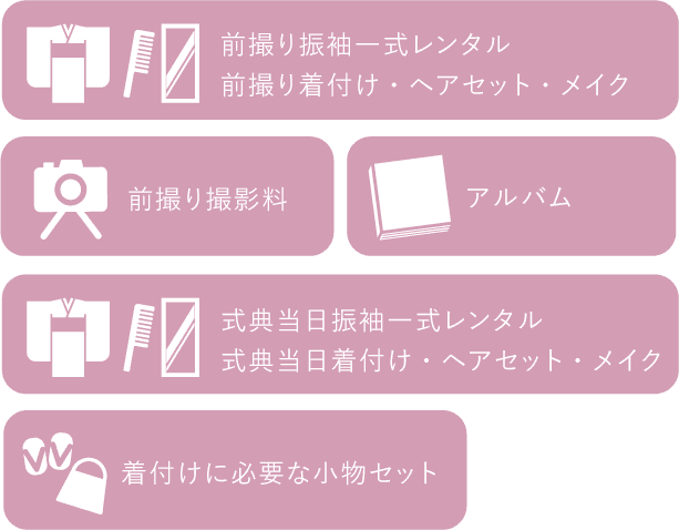 季絆梛の振袖レンタルプランは、前撮りと成人式典当日に必要なものが全て揃ったプランなので、安心して振袖をお選びいただけます。